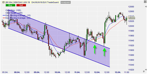 Est-il possible d'acheter dans ce canal de tendance au niveau du support afin d'obtenir un meilleur prix ? C'est effectivement possible. La seule question est de savoir si ce trade peut également être considéré comme un trade à forte probabilité. Par exemple, le 9 avril, le mini DAX passe en dessous du canal de consolidation pendant quelques heures. Bien sûr, cette fausse cassure pourrait servir de point d'entrée dès que le mini DAX entre à nouveau dans le canal. Le lendemain (11 avril), nous observons une deuxième baisse qu'il faut s'abstenir de négocier. Le fait est que tant que le marché est dans une zone de consolidation, son comportement doit être considéré comme "incertain". C'est pourquoi nous déconseillons plutôt un trade à l'intérieur du range.